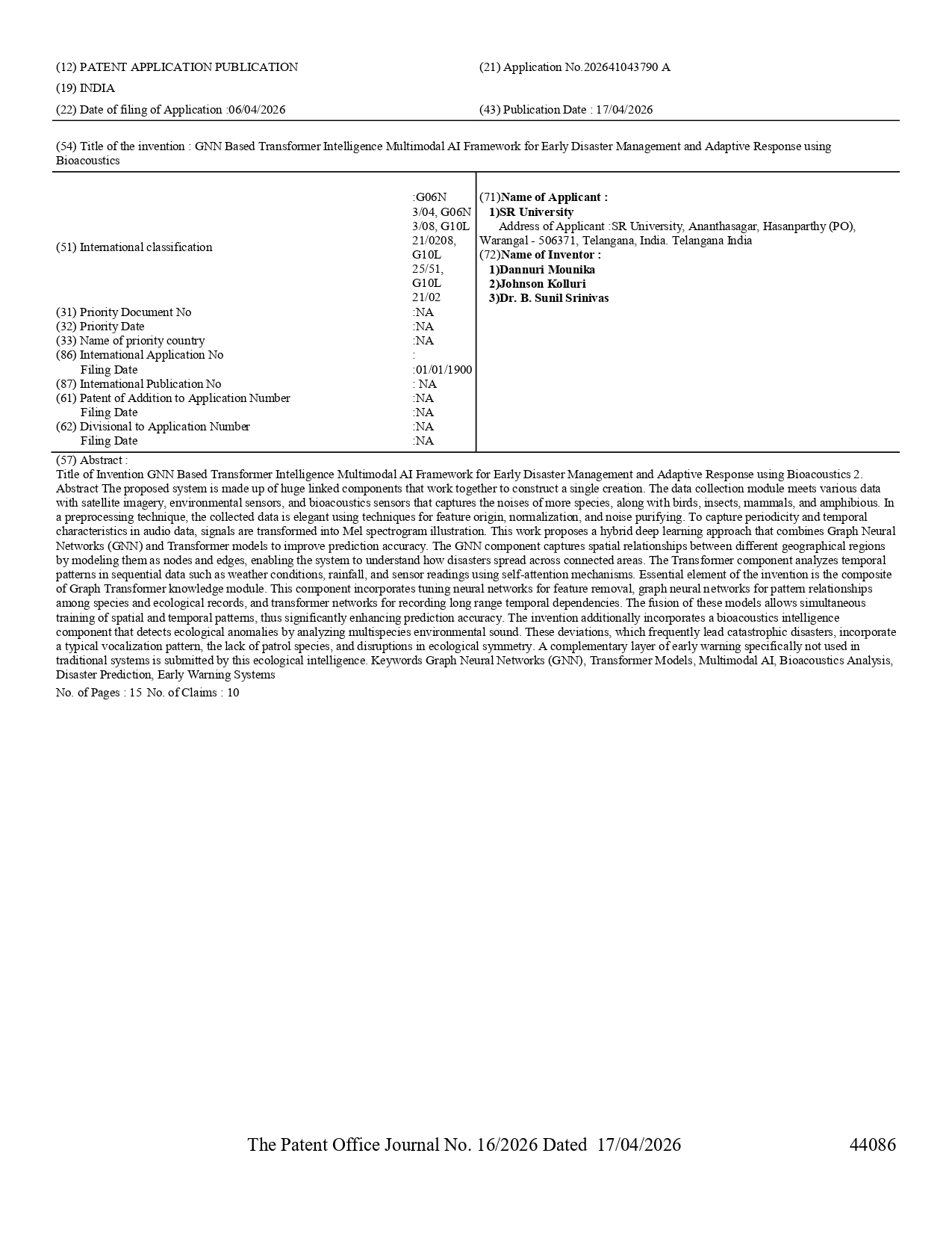 An advanced AI framework that combines Graph Neural Networks (GNN) and Transformer models to analyze multimodal data, including bioacoustic signals and environmental inputs, for early disaster prediction and adaptive response.