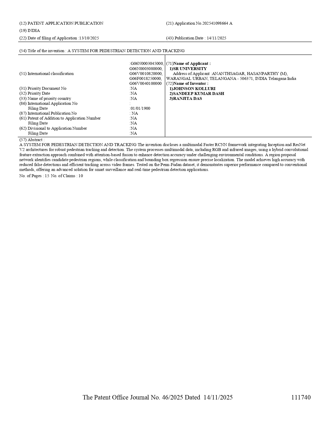 Johnson Kolluri, Sandeep Kumar Dash, Ranjita Das “MM_Fast_RCNN_ResNet: Construction of Multomodel Faster RCNN Inception and ResNet V2 for Pedestrian Tracking and Detection” is accepted in the International Journal of Maritime Engineering (ISSN/E-ISSN : 1479-8751/1740- 0716).