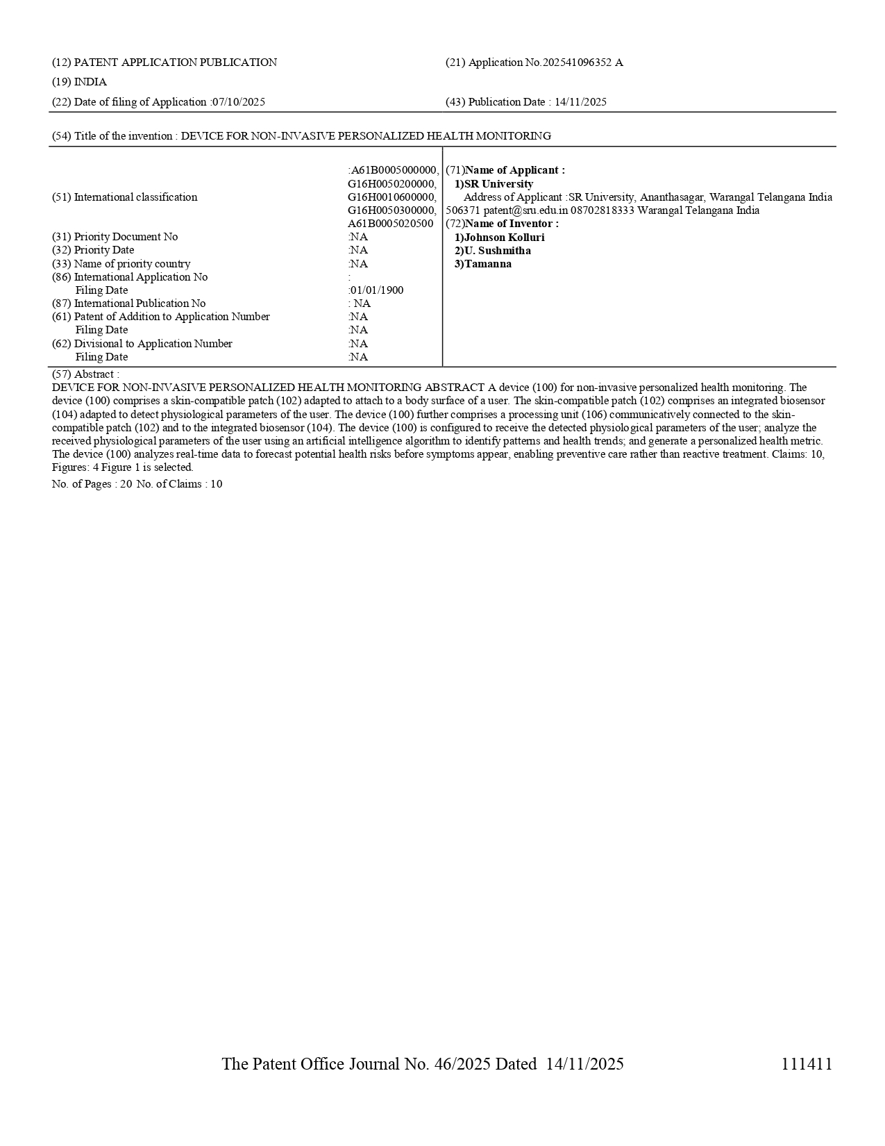 The proposed invention is a smart, non-invasive skin patch designed for continuous, real-time health monitoring. It tracks multiple vital biomarkers such as glucose, heart rate, hydration, and stress levels, providing personalized insights through AI-driven analysis. This innovation enables proactive healthcare management, offering timely predictions and alerts to users and healthcare providers. 1. Sensor Monitoring: The patch contains multiple biosensors that measure vital signs and health biomarkers