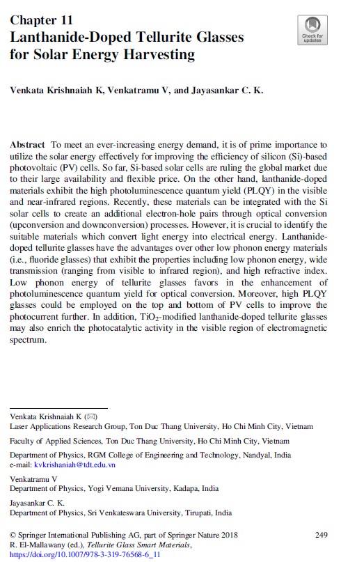 16. V.B. Sreedhar, K. Venkata Krishnaiah, Sk.N. Rasool, V.Venkataramu, C.K. Jayasankar, Raman and photoluminescence studies of europium doped zinc-fluorophosphate glasses for photonic applications, J. Non-Crystalline Solids, 505 (2019) 115-121, IF = 4.458, Cites:16, Q1 rank (https://doi.org/10.1016/j.jnoncrysol.2018.10.035), Percentile = 18.18%
