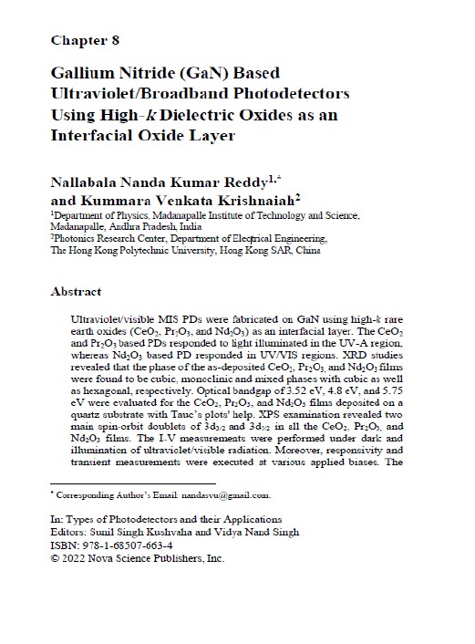 8. N.N.K.Reddy, M.R.V.Reddy, V.R. Singh, K.R. Bakash, S. Kumar, D. Saha, V.Mahendran, K. Venkata Krishnaiah, G.G.Krishna, V.S.V. Prabhakar, Enhanced photoresponse performance in GaN based symmetric type MSM ultraviolet-A and MIS ultraviolet-A to C photodetectors, Sensors and Actuators: A. Physical 339 (2022) 113502, IF = 4.9, Cites:1, Q1 rank (https://doi.org/10.1016/j.sna.2022.113502), Percentile =17.72%