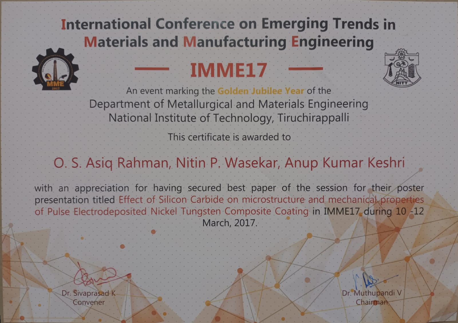 O.S. Asiq Rahman, Nitin P. Wasekar, G. Sundararajan, Anup Kumar Keshri, Experimental investigation of grain boundary misorientations and nanotwinning induced strengthening on addition of silicon carbide in pulse electrodeposited nickel tungsten composite coating, Materials Characterization,116, (2016), 1–7. (IF: 5.5, h5 index: 68) https://doi.org/10.1016/j.matchar.2016.04.002