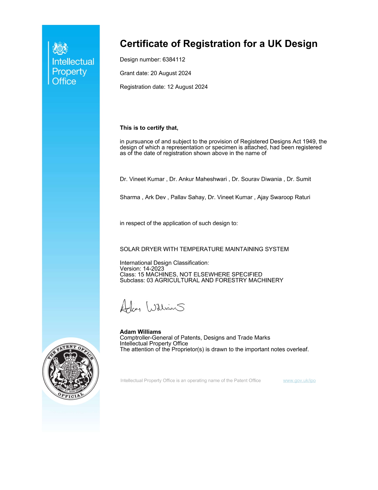 A Solar Dryer with Temperature Maintaining System is a UK-patented device designed to dry agricultural or food products using solar energy while keeping the internal temperature stable for optimal efficiency. The system improves drying speed and product quality by preventing overheating or temperature fluctuations. It offers an energy-efficient, eco-friendly alternative to conventional electric or fuel-based dryers.