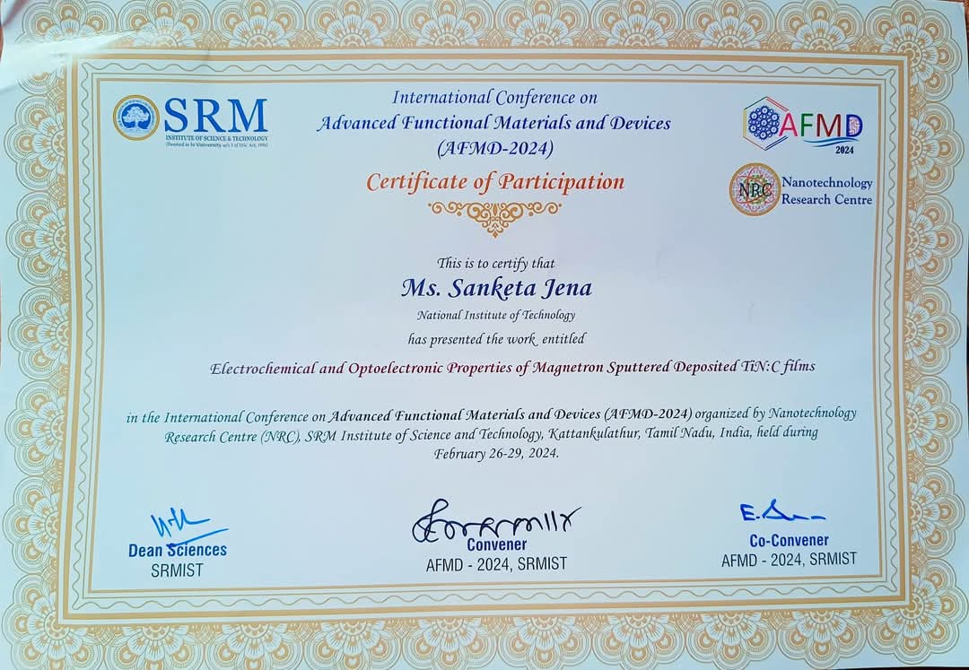 International Conference on Advanced Functional Materials and Devices (AFMD-2024), Nanotechnology Research Centre (NRC), SRM Institute of Science and Technology, Kattankulathur, Tamilnadu, India, Feb 26-29, 2024.