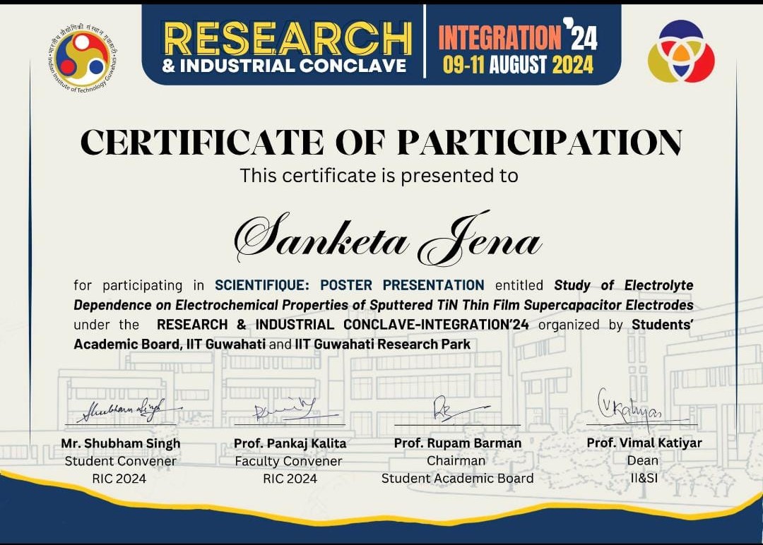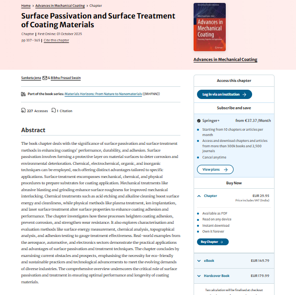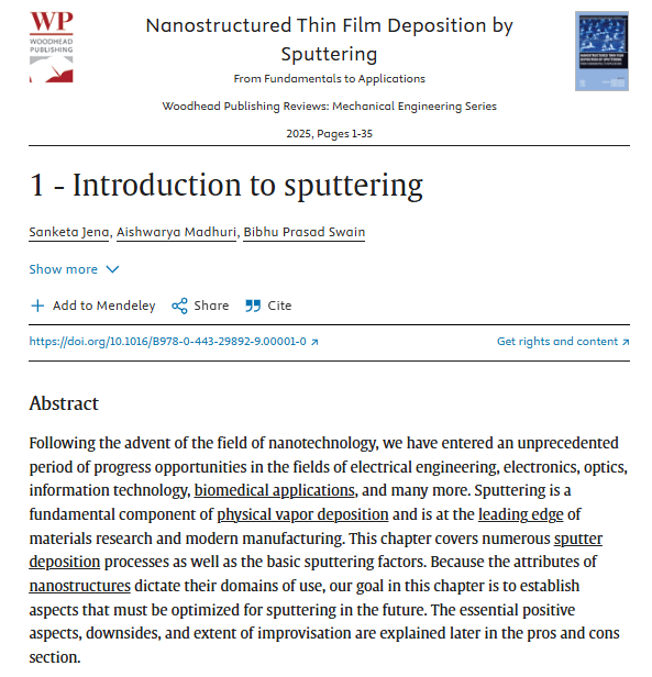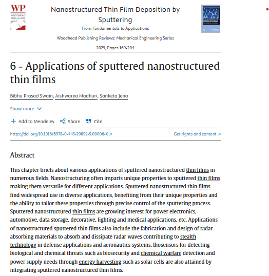 Sanketa Jena, Mukul Gupta, Bibhu P. Swain, Effect of interlayer thickness on electrochemical properties and corrosion resistance of sputtered TiNxnm/Tixnm multilayer thin films, Materials Science in Semiconductor Processing, 182 (2024) 108729, https://doi.org/10.1016/j.mssp.2024.108729, Q1 (I.F.-4.6)