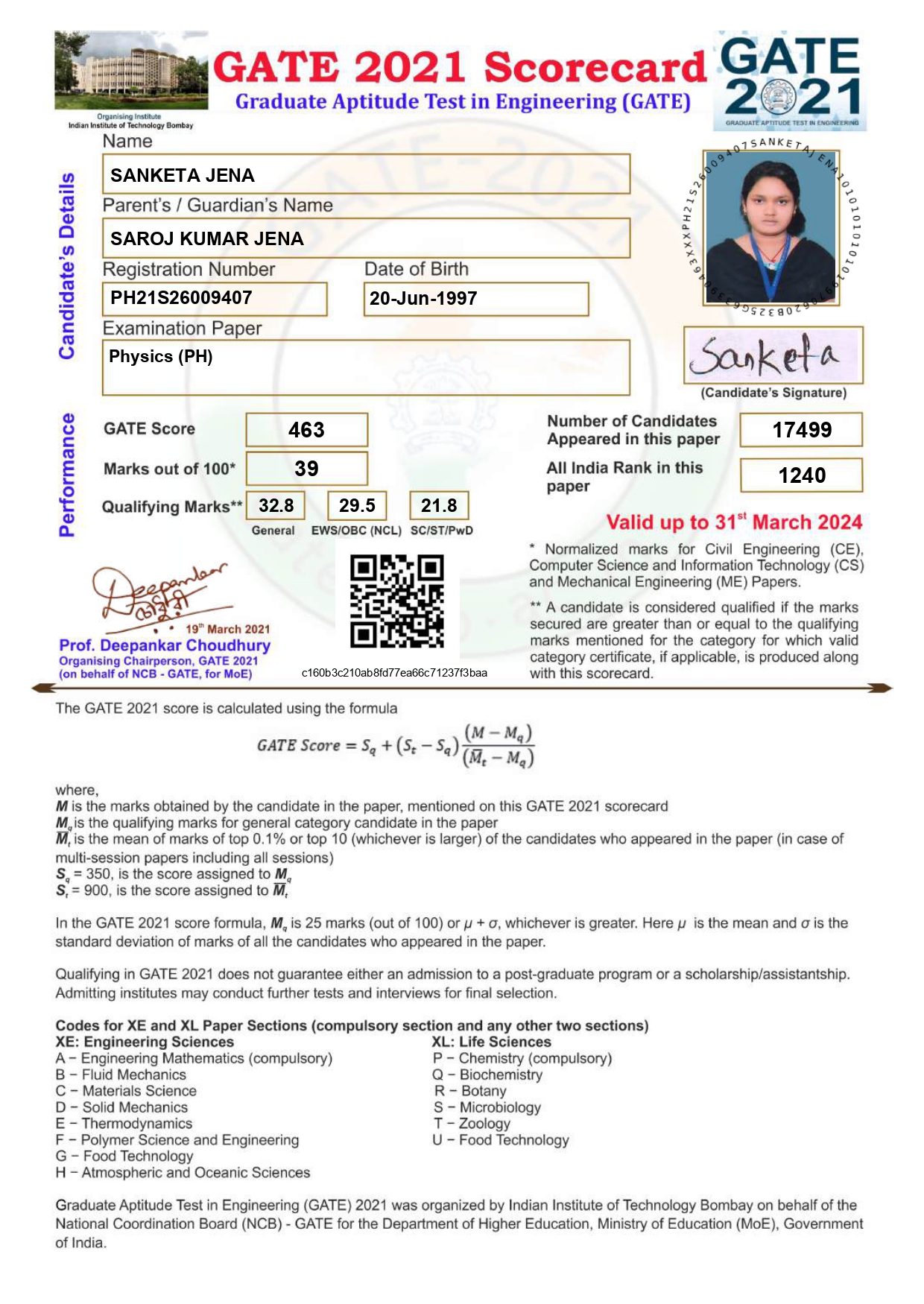 GATE 2021 Qualified, Graduate Aptitude Test in Engineering (GATE), National-level Examination in Physics, India, Gate Score-463