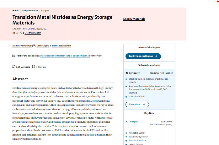 Sanketa Jena, Soumyadeep Laha, Bibhu P. Swain, Ti2NTx MXene/rGO nanocomposites: Optical tunning, functional bonding and electrochemical analysis for supercapacitor electrode application, Applied Surface Science, 666 (2024) 160403, https://doi.org/10.1016/j.apsusc.2024.160403, Q1 (I.F.-6.9)
