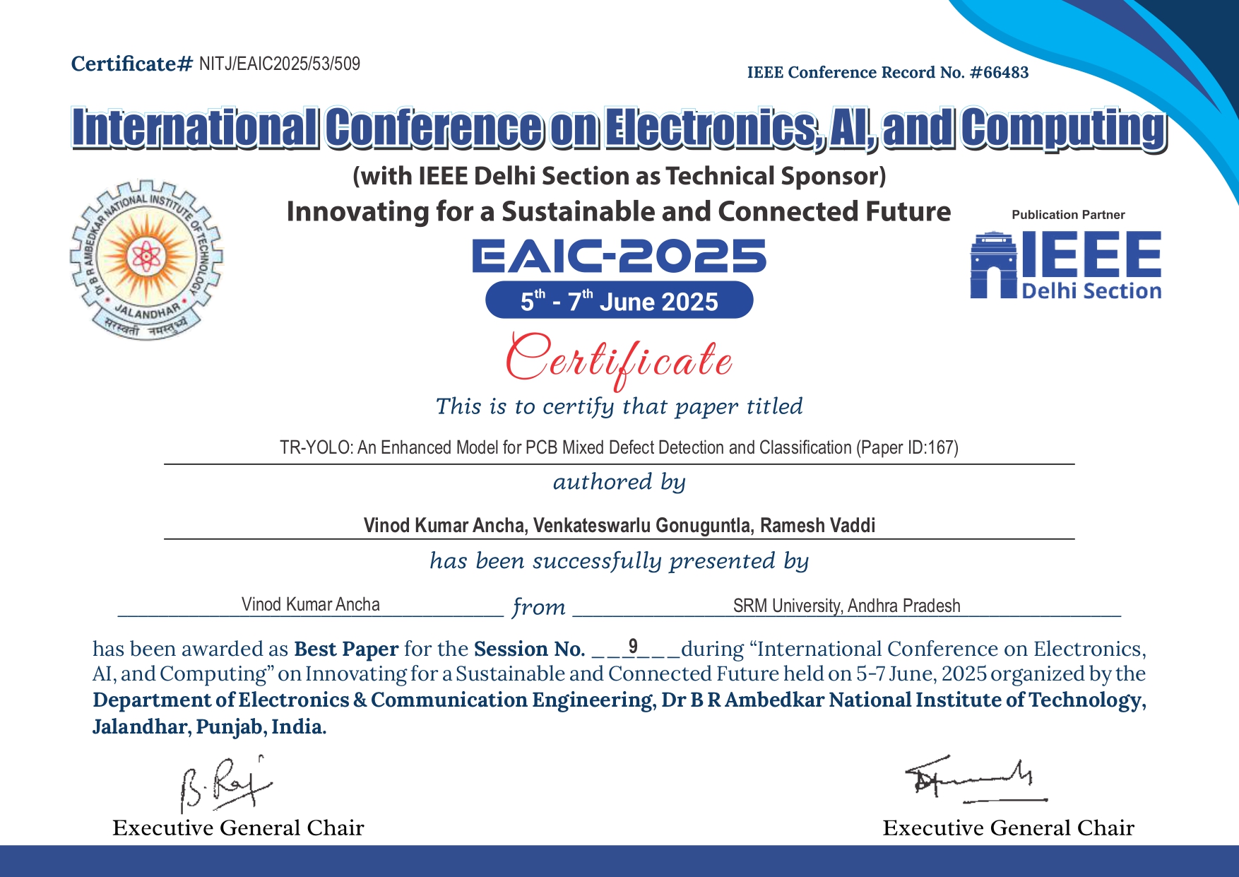 V. K. Ancha, V. Gonuguntla and R. Vaddi, "TR-YOLO: An Enhanced Model for PCB Mixed Defect Detection and Classification," 2025 International Conference on Electronics, AI and Computing (EAIC), Jalandhar, India, 2025, pp. 1-6, doi: 10.1109/EAIC66483.2025.11101424