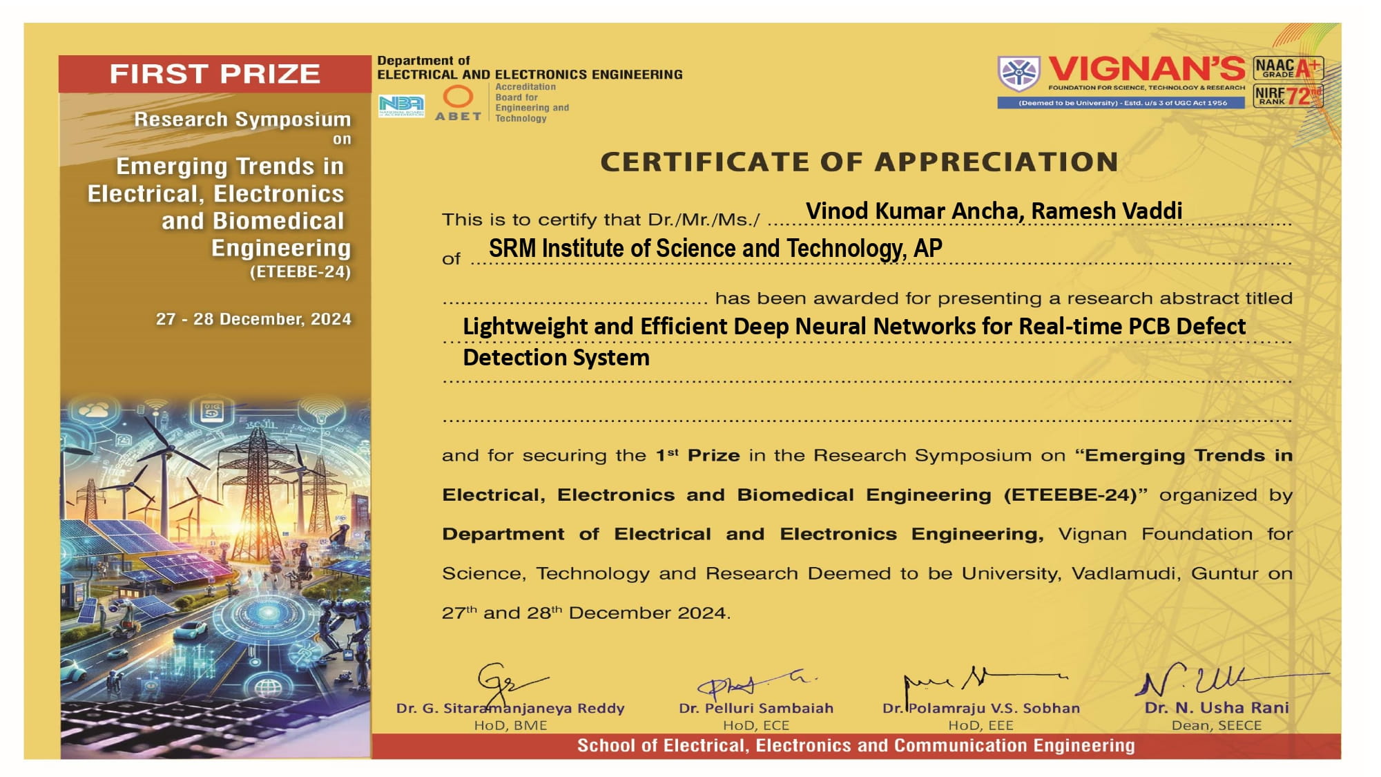 V. K. Ancha, V. Gonuguntla, and R. Vaddi, “CSPGhost-YOLO: a lightweight and robust model for real-time mixed PCB defect detection system,” Measurement, p. 120521, Jan. 2026, doi: https://doi.org/10.1016/j.measurement.2026.120521. (Q1, IF:5.6) (2026)